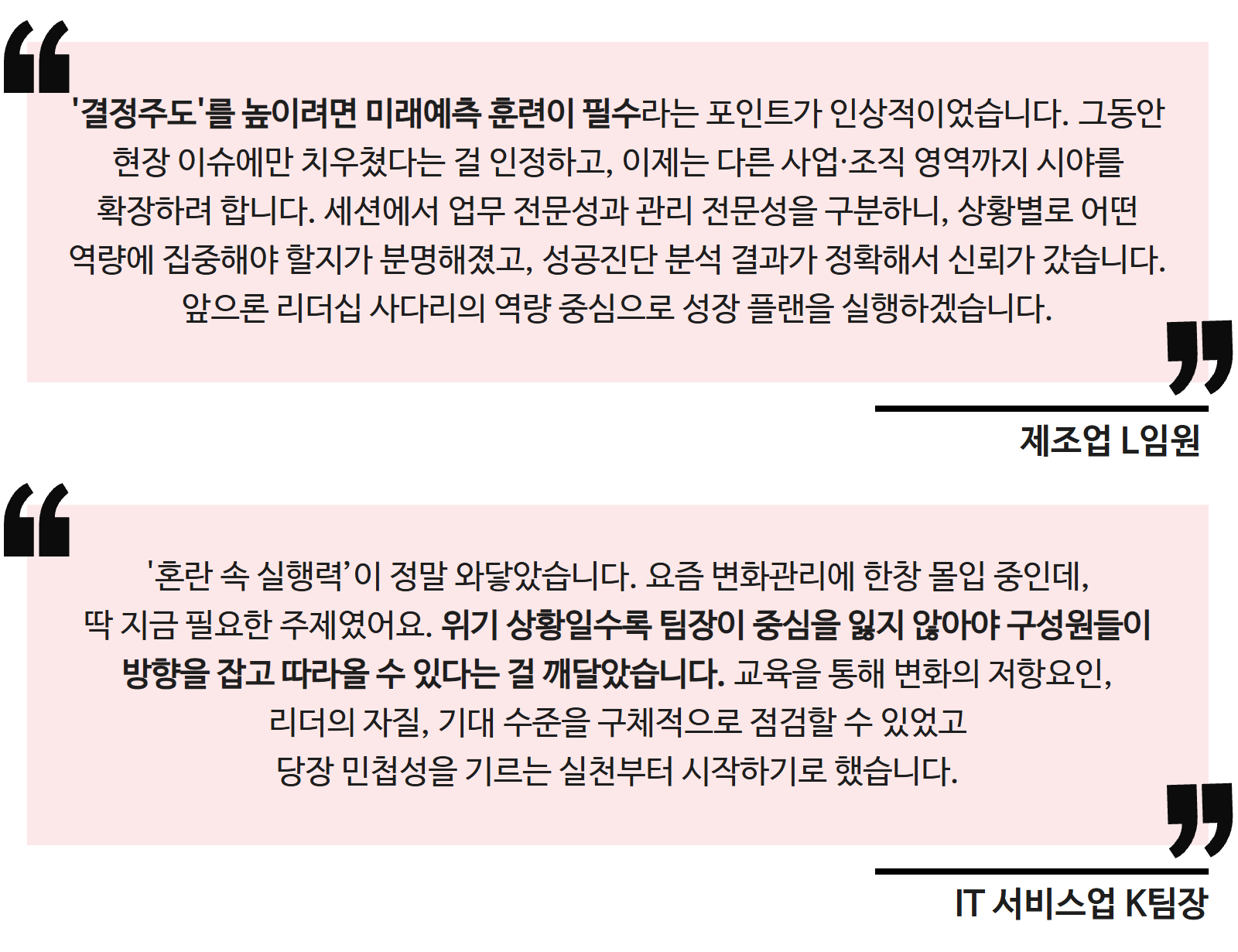 신임 관리자, 임원, C-Level 각 직급마다 요구되는 역량은 다릅니다. 그러나 '결정주도'와 '혼란 속 실행력'은 모든 리더에게 공통으로 요구되는 핵심 역량입니다. 이 두 가지는 직급이 올라갈수록 오히려 그 중요성이 커지며, 불확실한 상황에서 방향을 제시하고 행동으로 옮기는 리더십의 본질을 이룹니다.
