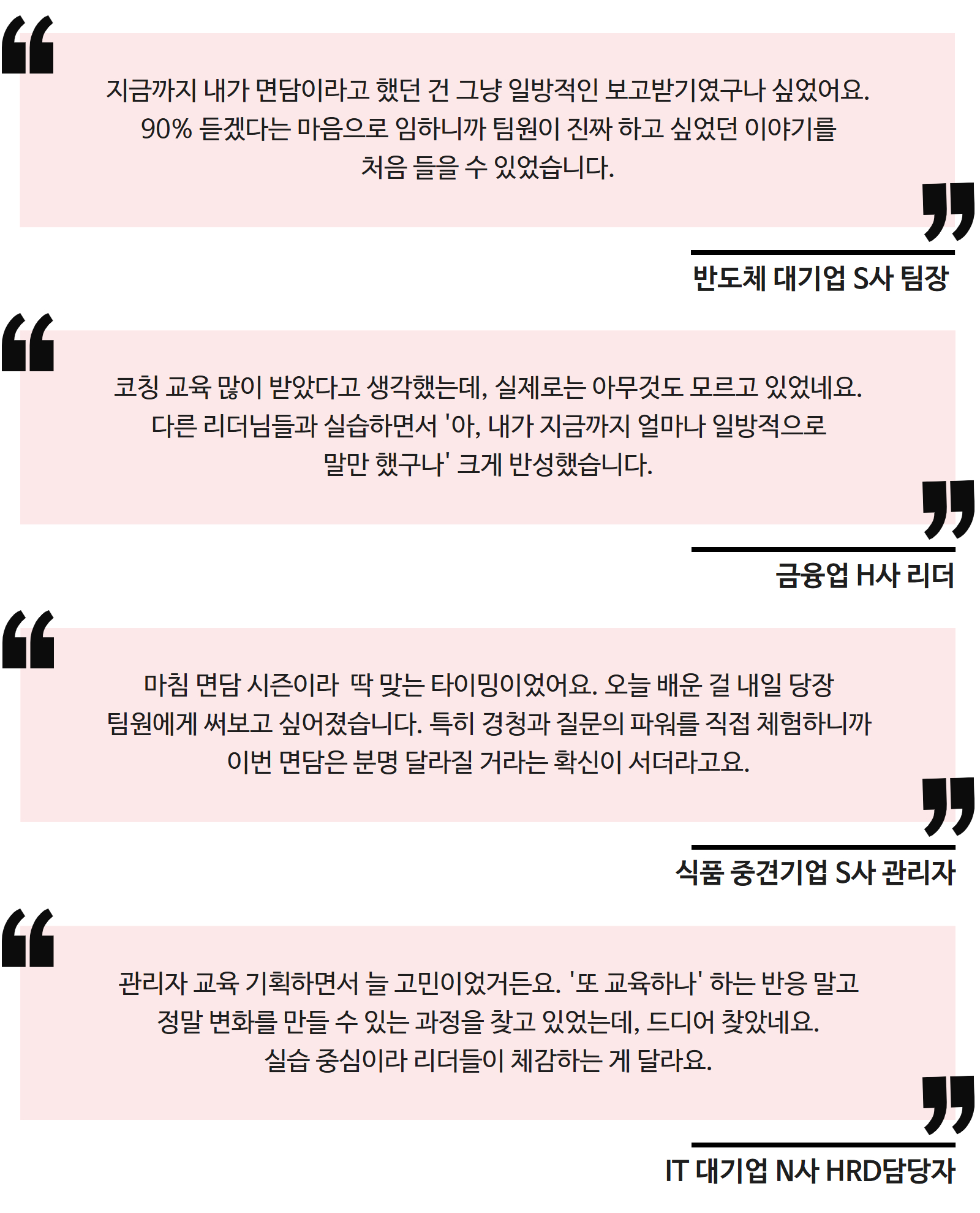 ๊พธ์คํ ์ ๋ขฐ์ ๊ด์ฌ์ ์ฌ์ด์ผ ์ข์ ์ฑ๊ณผ๋ฅผ ๊ฑฐ๋ ์ ์์ต๋๋ค. ์ข์ ์ฑ๊ณผ๋ฉด๋ด์ ๋จ ํ๋ฃจ์ ์ด๋ฒคํธ๊ฐ ์๋๋ผ, ํ์ 1on1(์์จ์)์ด๋ผ๋ '๋ํ์ ๋ฃจํด' ์์ ์์ด๋ ๊ฒฐ๊ณผ๋ฌผ์